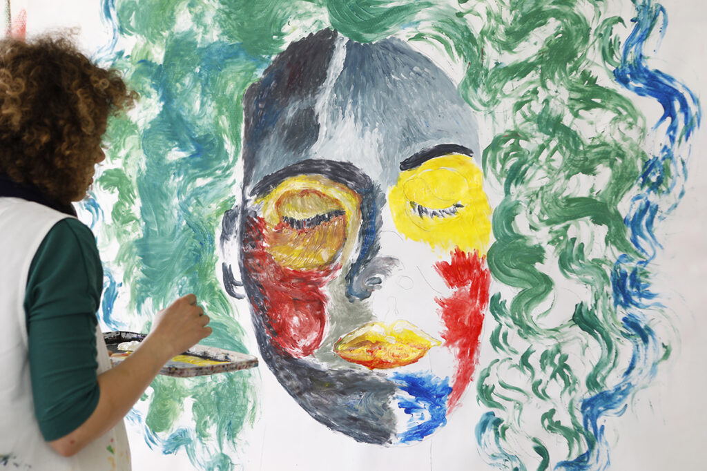 Dieses Portrait – als Blick des anderen auf uns – ist dann in einem zweiten Schritt Vorlage für eine malerische Umsetzung eines überlebensgroßen Selbstbildes. Diese Herangehensweise kann zweifach einen neuen Blick der Klient:innen auf sich selbst eröffnen. Im Fotografiert-Werden können sie sich ganzheitlicher wahrnehmen, sie lernen zwischen Realität und Subjektivität zu unterscheiden. Im anschließenden Malprozess steht man sich selbst gegenüber. Dieses großformatige Arbeiten ermöglicht Großzügigkeit – auch sich selbst gegenüber, mit wenig Platz für kleinteilige Kritik.