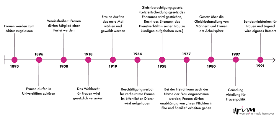 Die Wurzeln des Patriachats liegen Jahrhunderte zurück. Ein kurzer Blick auf die letzten 130 Jahre verrät aber schon, dass Frauen lange Zeit keine Rechte hatten, um zum Beispiel wählen oder arbeiten zu gehen. Die Geschichte der rechtlichen sowie gesellschaftlichen Gleichstellung von Frauen soll an dieser Stelle nicht im Detail betrachtet werden. Aus dem Zeitstrahl lassen sich jedoch patriarchale Strukturen gut ablesen.