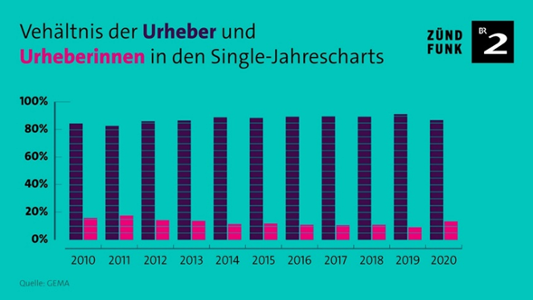 Die Analyse der Top-100-Single-Jahrescharts aus Deutschland in dem Zeitraum von 2010 bis 2020 zeigt, dass 81% der in den Titeln genannten Acts männlich waren, nur 13% aller Urheber:innen weiblich und es nur fünf Deutschrap-Songs mit rein weiblicher Beteiligung gab.9