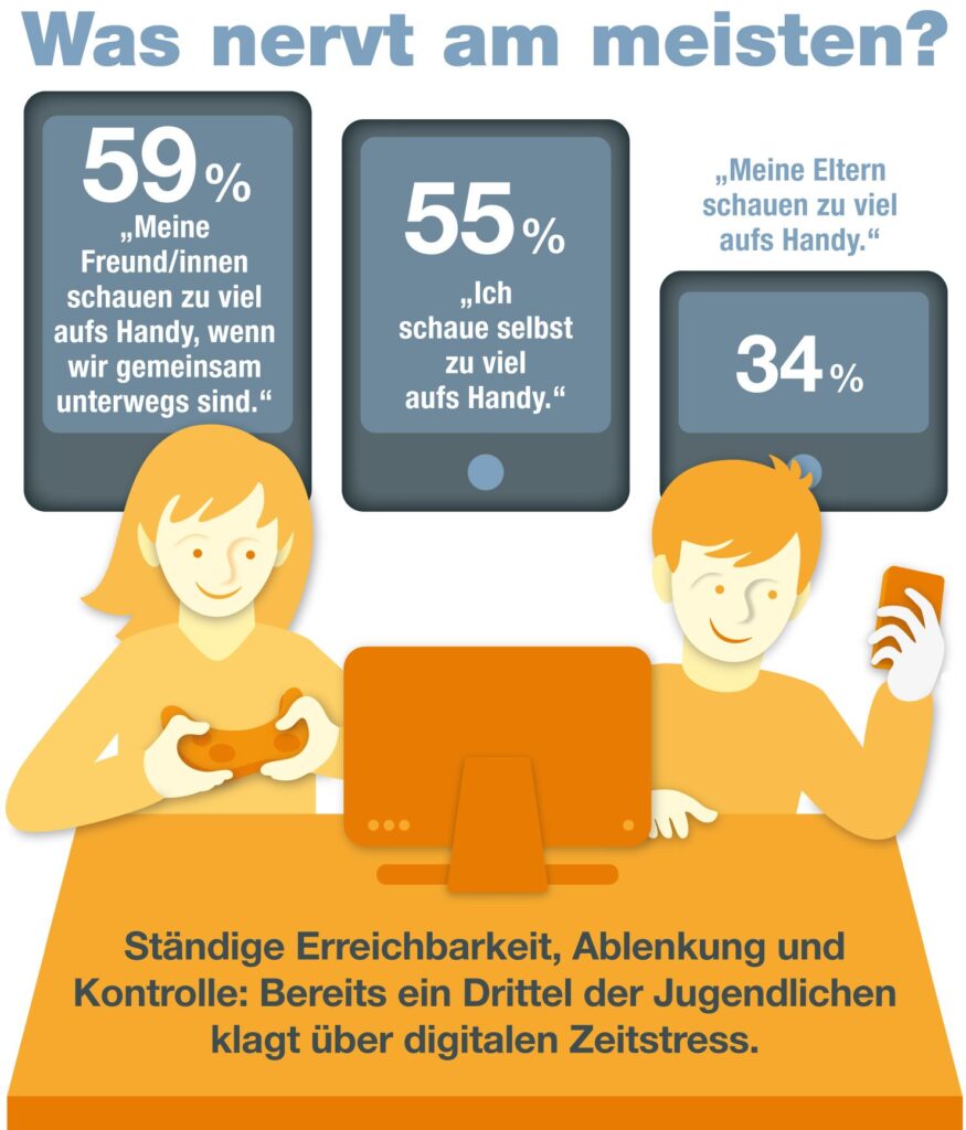 Diese intensive Nutzung führt jedoch dazu, dass sich viele Jugendliche im „digitalen Zeitstress“ befinden. Unter diesem Titel veröffentlichte das österreichische Institut für Jugendkulturforschung im Februar 2019 eine Studie, die sich mit dem sozialen Druck digitaler Medien beschäftigte. Die befragten Jugendlichen beklagten auch, dass sie bzw. ihre Freunde zu häufig aufs Handy schauen würden. Als Konsequenz riet das Institut zu einem „maßvollen Online-Konsum im Alltag“6, also ebenfalls zu einer bewussten, kompetenten Mediennutzung.