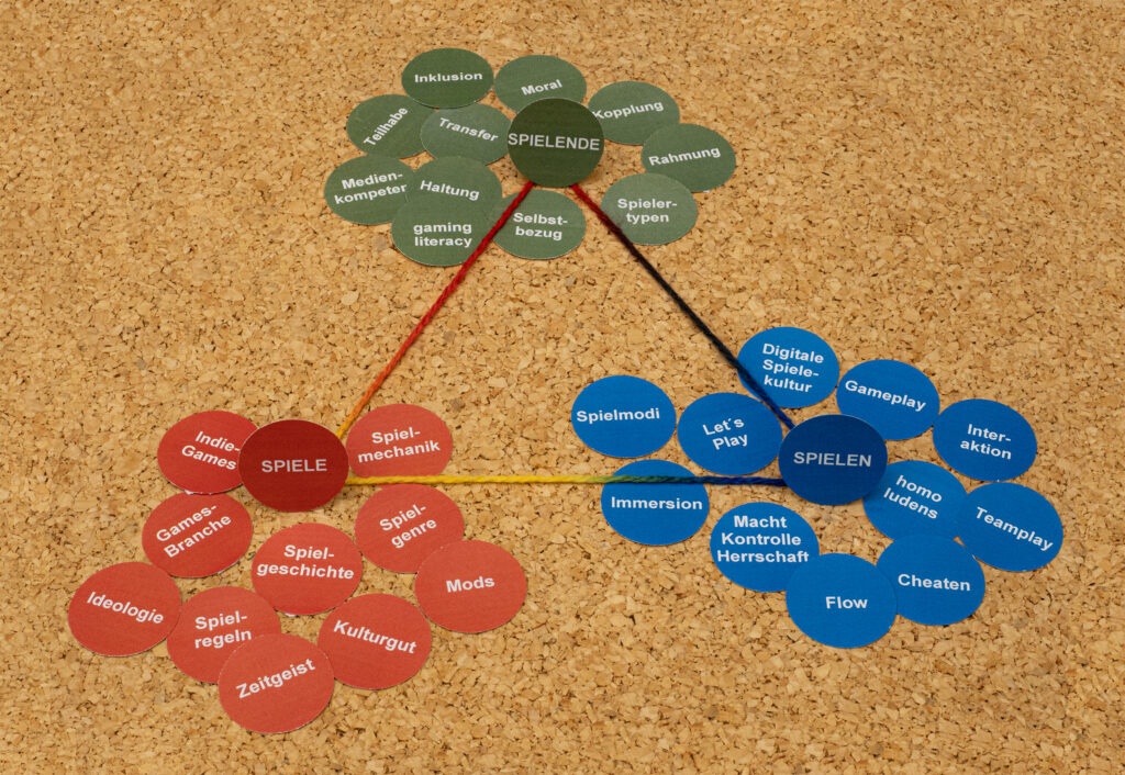 Dieses Dreieckstellt das Beziehungsgefüge in Form einer Interdependenz dar, in der sich Spielende, das Spielen und (digitale) Spiele in vielfältigen Abhängigkeiten befinden und wechselseitig beeinflussen. Es ist ein Konstrukt und kann als Werkzeug in unseren Methoden-Rucksack gepackt werden, den wir als Pädagog:innen stets dabeihaben. In einer Spieletest-Gruppe, einer Unterrichtsstunde „Praktische Philosophie“ oder einem Workshop in der Erwachsenenbildung können in einem ersten Schritt Begriffe gesammelt werden, die von den Teilnehmenden im Kontext „Digitale Spiele“ assoziiert werden.