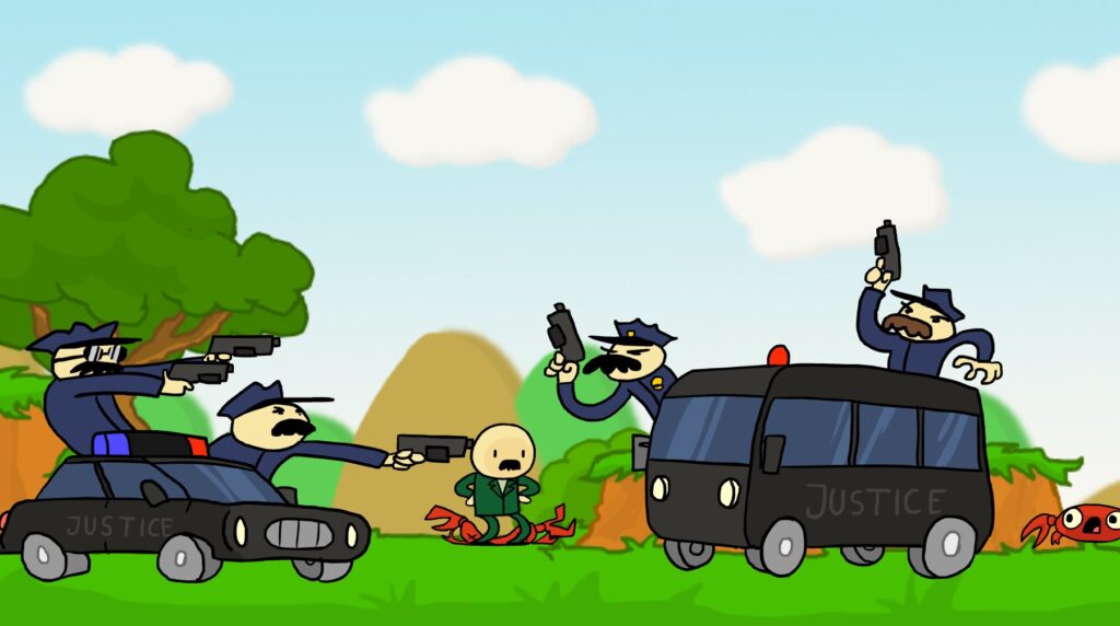 Zum Spiel: Auf dem Startbildschirm sehen wir eine kleine schnauzbärtige Spielfigur, die wir als Spielende auf den Weg zu seiner Freundin steuern dürfen. Wir können sie nach rechts und links bewegen und springen lassen – mehr scheint nicht möglich, mehr verrät uns das Spiel nicht. Spielen wir weiter, laufen alsbald einige Krabben von uns unbeeindruckt im Krabbenstil hin- und her. Springen wir, absichtlich oder aus Versehen auf eine Krabbe, so stirb diese, wir werden noch im selben Moment verhaftet und müssen uns vor Gericht verantworten. Unser Verhalten im weiteren Spielverlauf entscheidet darüber, wie wir zum Schluss von unserer Freundin empfangen und behandelt werden. Nach einem ersten Spieldurchlauf drängt sich die Frage auf, wie das Spiel verlaufen würde, wenn wir es anders spielen. Schnell lassen sich weitere Versuche starten und herausfinden, ob und wie der Spielverlauf verändert werden kann. Spoiler: Es gibt sogar ein Ende mit Einhorn und Regenbogen…