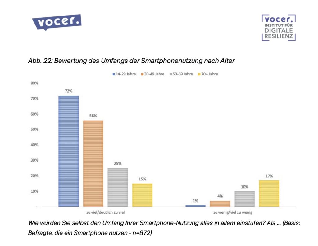 Außerdem verursachen der digitale Konsum und die verdichtete, permanente Berichterstattung über die sich überlappenden, weitreichenden Krisen bei vielen Menschen alarmierende Symptome eines psychischen Unwohlseins und einer allgemeinen Erschöpfung – so eines unserer zentralen Studienergebnisse. Viele Nutzende fühlen sich leer und ausgebrannt, wenden sich sogar in letzter Konsequenz von digitalen Medien ab – aus Selbstschutz. Die Hälfte der befragten unter 30-Jährigen fühlt sich schon dadurch gestresst, dass sie ständig durch ihre digitalen Endgeräte erreichbar sind. Ein Viertel der Befragten unter 30 beklagt auch psychische Probleme. Das sind alles in allem beunruhigende Befunde, die auch internationale Studien bestätigen.